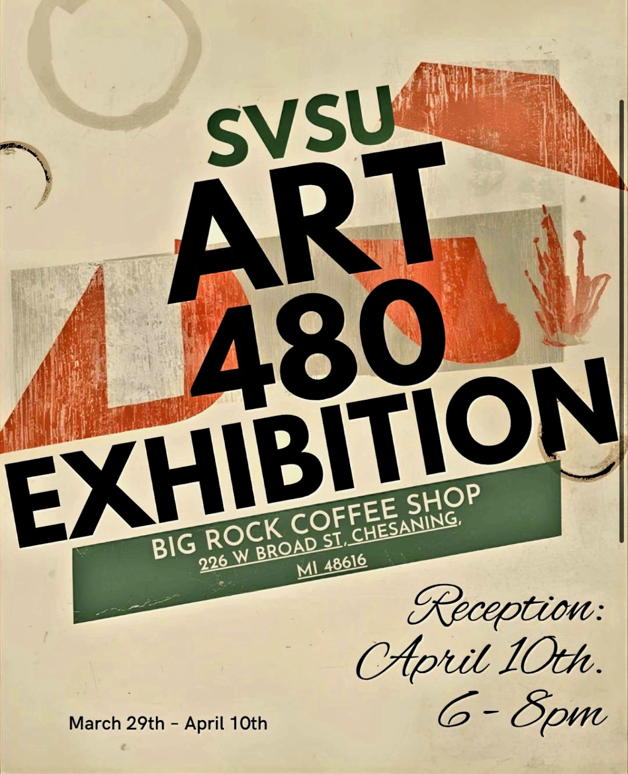The ART480 class invites you to their curated exhibition at Big Rock Coffee & Events in Chesaning. The exhibition will take place Tuesday, March 31 through Friday, April 10.